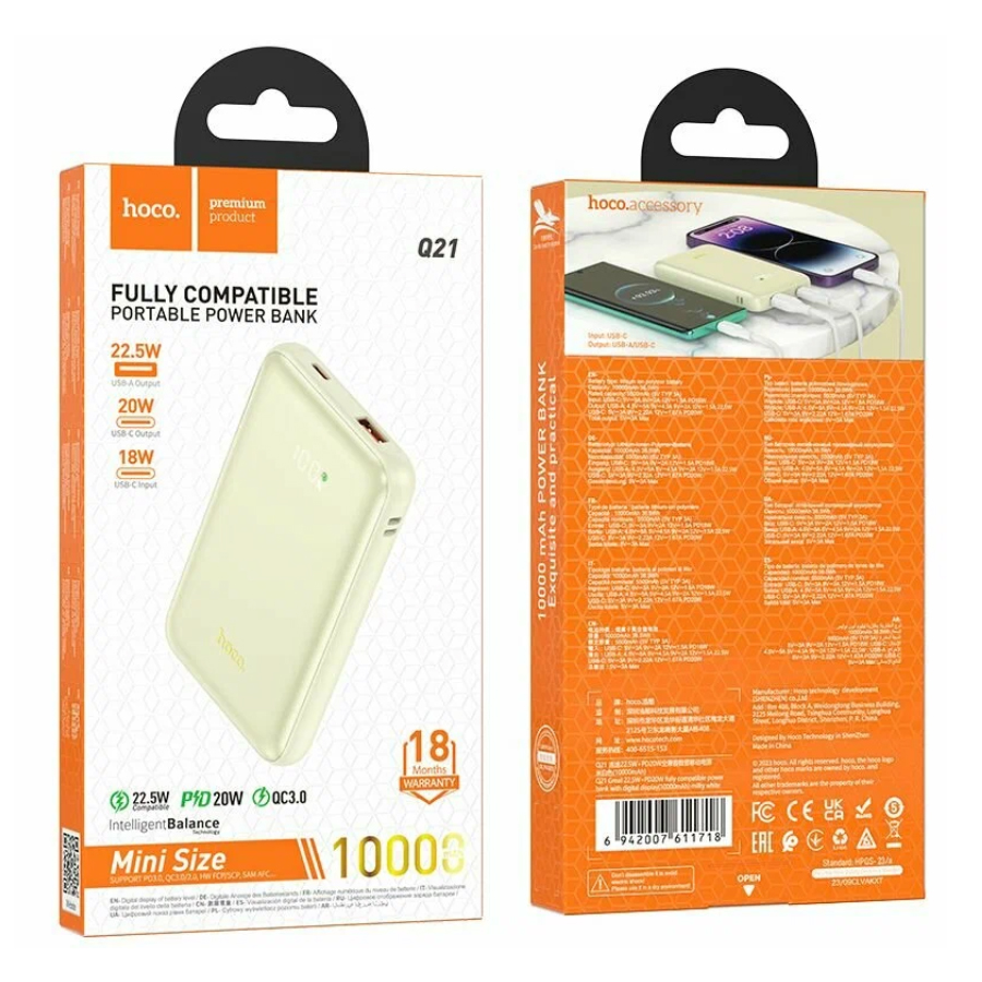 Портативный аккумулятор Hoco Q21 Great - это суперкомпактный, функциональный и самый маленький внешний аккумулятор на рынке. Его ёмкости в 10000мАч достаточно для зарядки двух смартфонов во время коротких поездок. Устройство оснащено двумя выходными интерфейсами: универсальным портом USB и реверсивным разъёмом Type-C, который отдаёт и принимает заряд. Уровень оставшейся энергии отображается в процентах на светодиодном дисплее.